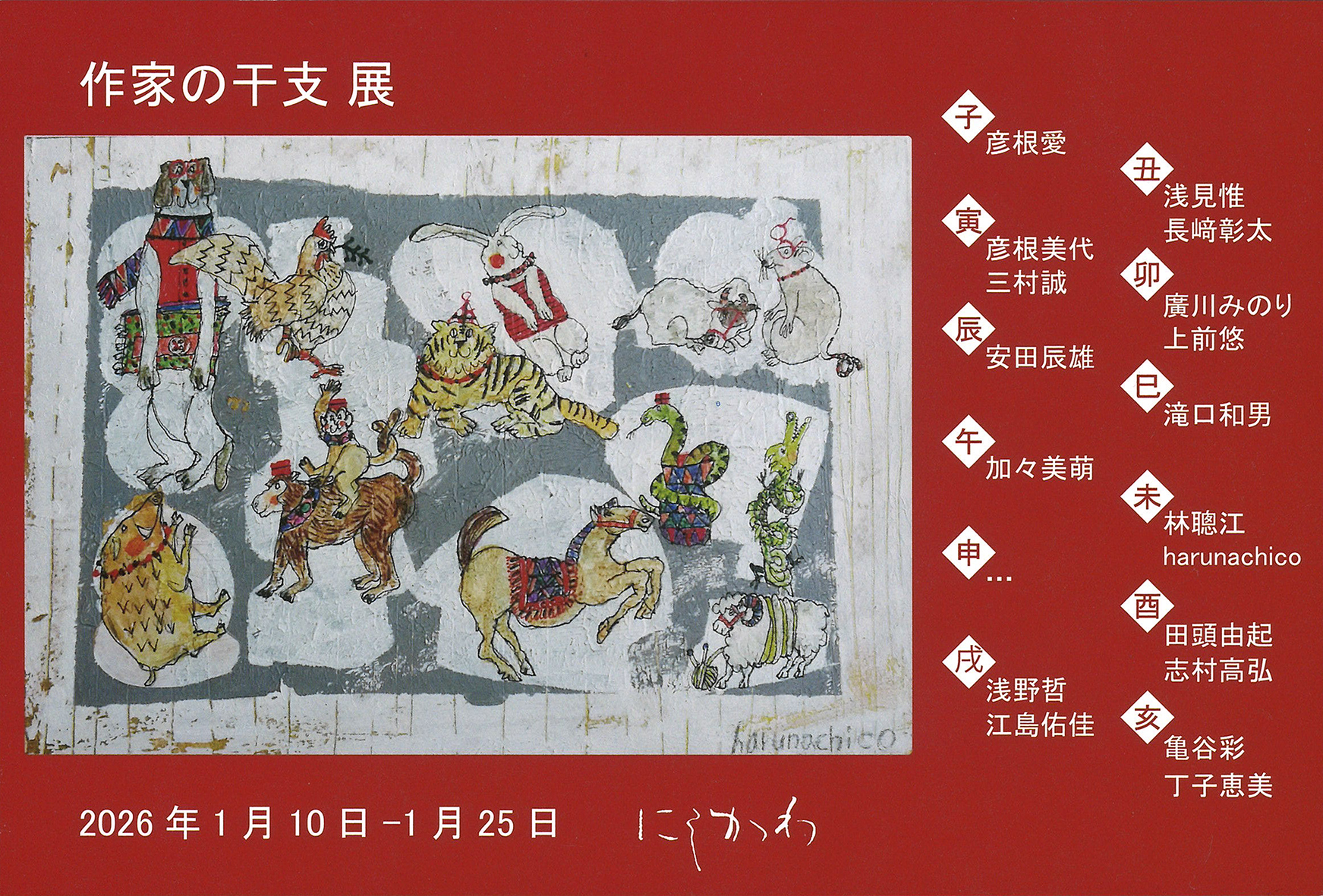 1月10日〜25日 作家の干支展 ギャラリーにしかわ(京都河原町)12:00〜19:00 最終日17:00 月曜休廊 2月13日公開 たち吉WEB販売「ねこ日和」 5月13日〜18日 阪急梅田 たち吉コーナー 6月6日〜14日 個展 楽空間 祗をん小西(京都市) 7月 2人展 GALLERY安曇野(弘前市)